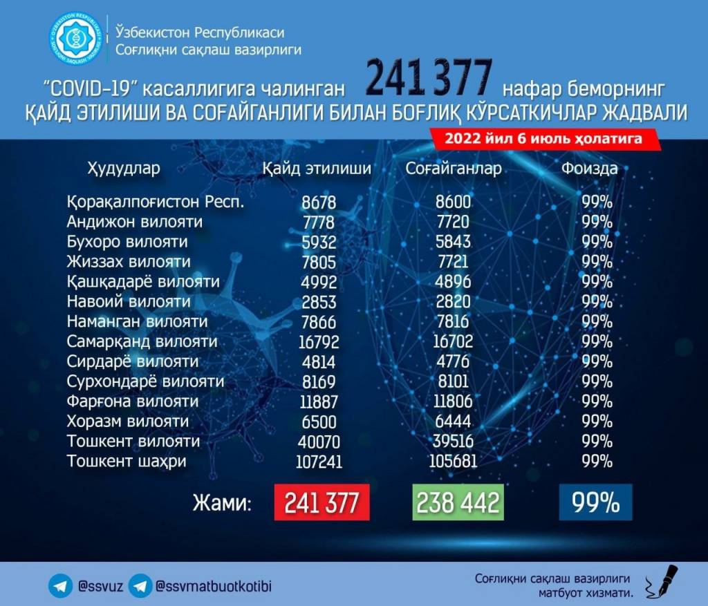 أفادت وزارة صحة جمهورية أوزبكستان بأن عدد المصابين بفيروس كورونا في أوزبكستان بلغ 241377 مصابا صباح 7 يوليو الحالي حيث بلغ عدد المصابين 94 شخصا خلال 6 يوليو الحالي.