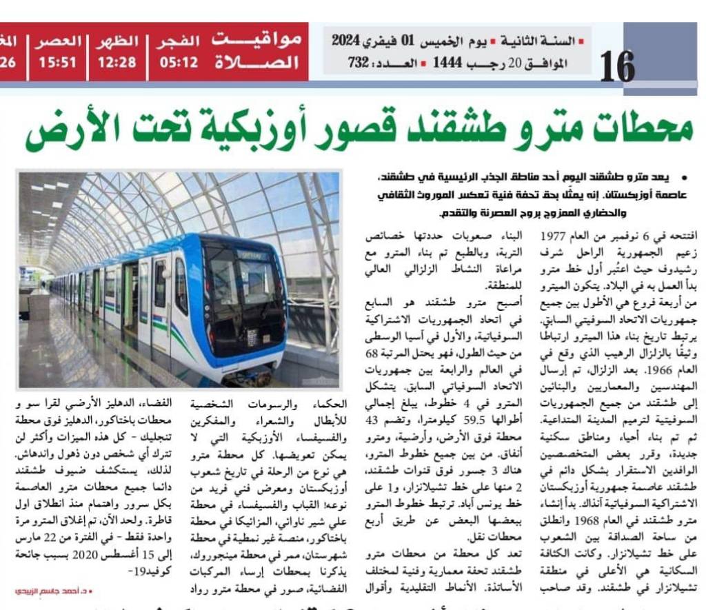 كتب الصحفي أحمد جاسم الزبيدي في الصحيفة الجزائرية "واحة اليوم" مقالة بعنوان "محطات مترو طشقند قصور أوزبكية تحت الأرض".