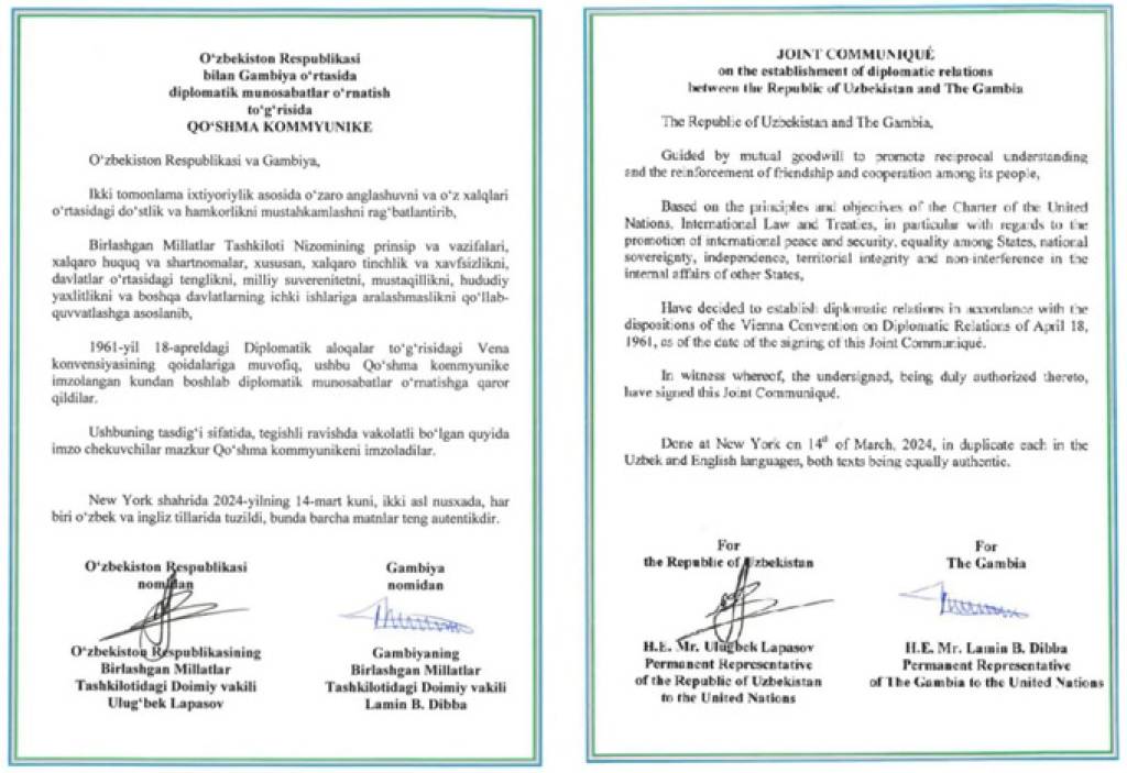 تم في 14 مارس الحالي بمدينة نيويورك التوقيع على البيان المشترك حول إقامة العلاقات الدبلوماسية بين جمهورية أوزبكستان وغامبيا.