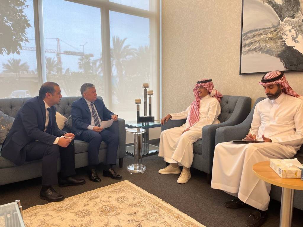 التقى السيد بهرام أعلائيف النائب الأول لوزير خارجية جمهورية أوزبكستان في العاصمة الرياض بالسيد محمد أبو نيان رئيس مجلس إدارة شركة "ACWA Power" والسيد ماجد أحمد السويح رئيس مجلس إدارة شركة "Tabuk Agricultural Development" والسيد طارق محمد أبو معطي المدير العام لشركة "Tariq M.Abu Moti" والسيد طارق الشوير مدير شركة "Al Showaier" والسيد أسامة بخاري المدير العام التنفيذي لشركة "Al Faris International Group".