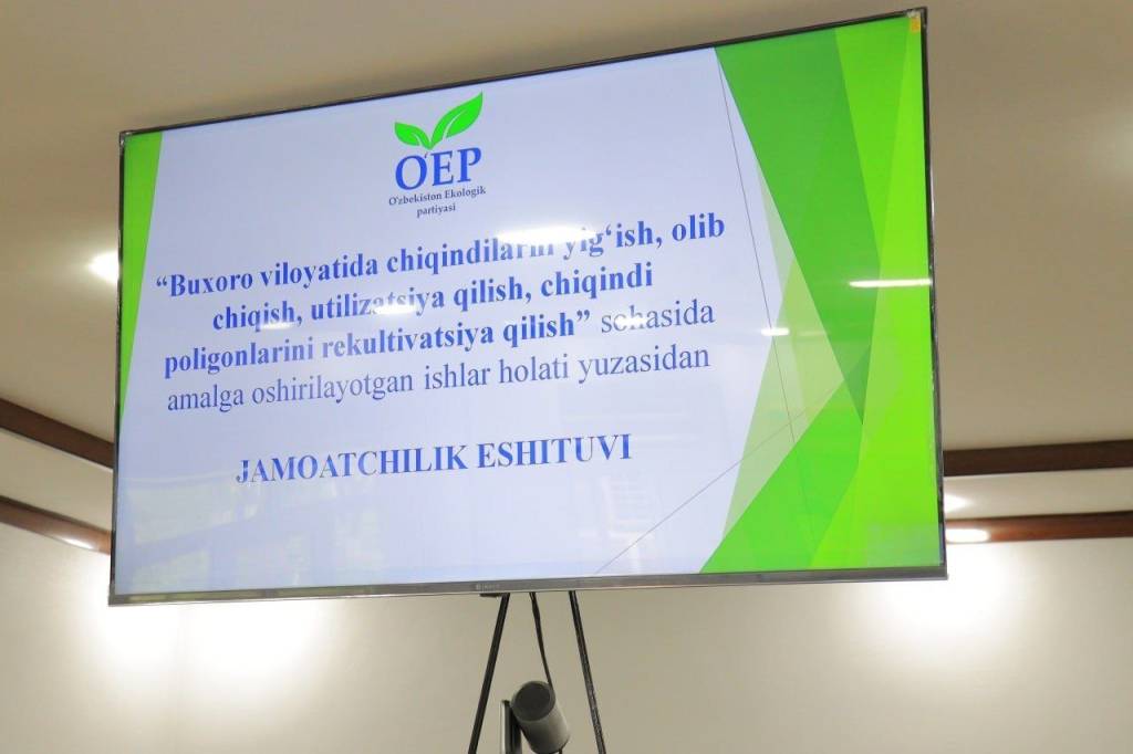 Мазкур эшитув “Бухоро вилоятида чиқиндиларни йиғиш, саралаш, олиб чиқиш, қайта ишлаш ва утилизация қилиш, шунингдек, чиқинди полигонларини рекультивация қилиш соҳасида амалга оширилаётган ишлар ҳолати” мавзусида бўлиб ўтди. Унда халқ депутатлари вилоят Кенгаши депутати, Ўзбекистон Экологик партияси вилоят Кенгаши раиси ўринбосари Жаҳонгир Шарипов бошчилигида мутасадди ташкилот ва идоралар вакиллари, жамоат ташкилотлари ҳамда оммавий ахборот воситалари ходимлари иштирок этди.
