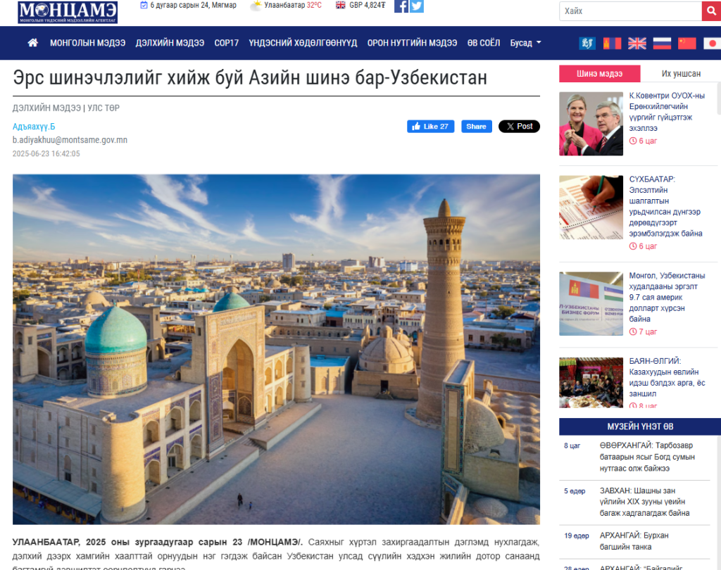 “Montsame” ахборот агентлиги “Ўзбекистон – туб ислоҳотларни бошдан кечираётган янги Осиё йўлбарси” сарлавҳали мақола эълон қилди. Муаллиф юртимиз сўнгги бир неча йил ичида мисли кўрилмаган ижобий ўзгаришларни бошдан кечираётганига эътибор қаратган.