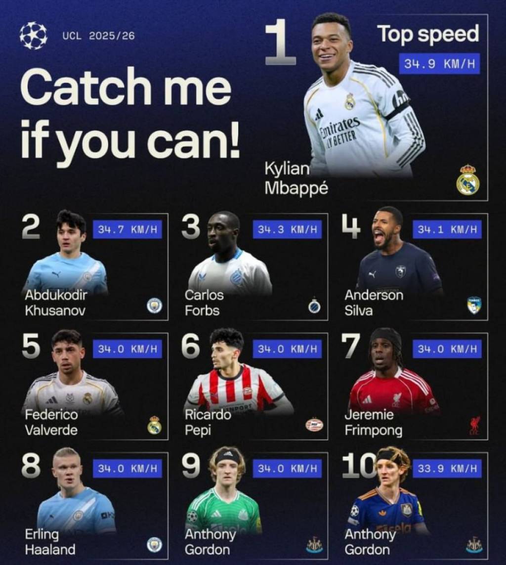 The French national team and Real Madrid player Kylian Mbappé ranked first in this ranking, with a top speed of 34.9 km/h. Abdukodir Khusanov ranked second with a score of 34.7 km/h.