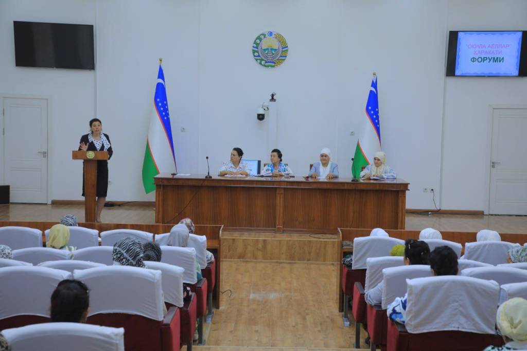 Форумда ҳаракат аъзоларининг туман хотин-қизларига мурожаатномаси ўқиб эшиттирилди. Маҳаллаларда оилавий қадриятларни мустаҳкамлашга муносиб ҳисса қўшаётган бир гуруҳ фаол аёллар тақдирланди.