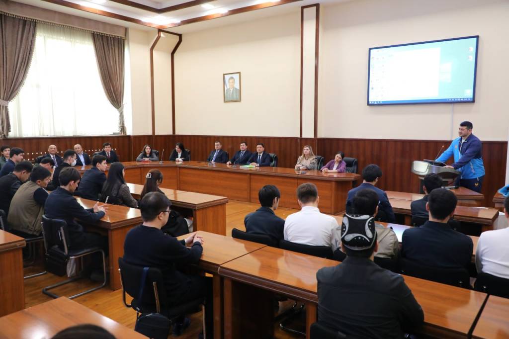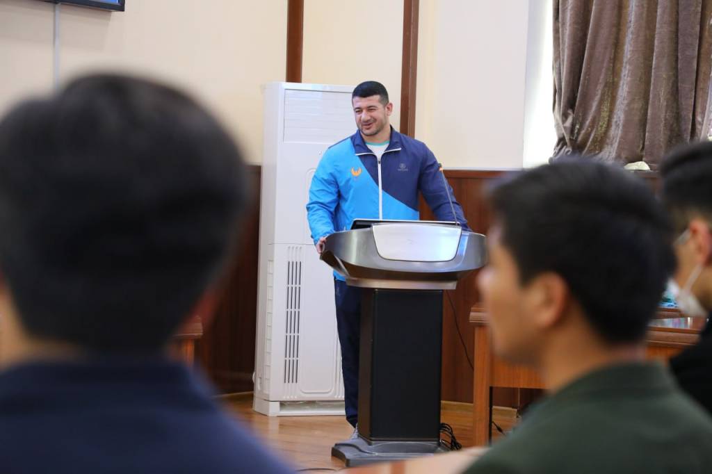 Университетнинг Молия ва молиявий технологиялар кафедраси ташаббуси билан ўтказилган тадбирда иштирок этган миллий спортимиз кураш бўйича 5 карра жаҳон чемпиони, 2 карра Осиё ўйинлари ғолиби, Ўзбекистон Республикаси Президенти соврини учун ўтказилган ўнга яқин халқаро турнирлар ғолиби Муҳсин Ҳисомиддинов талаба-ёшларга мамлакатимизда жисмоний тарбия ва спортни ривожлантириш борасида қилинаётган ишлар ҳақида сўзлаб берди.