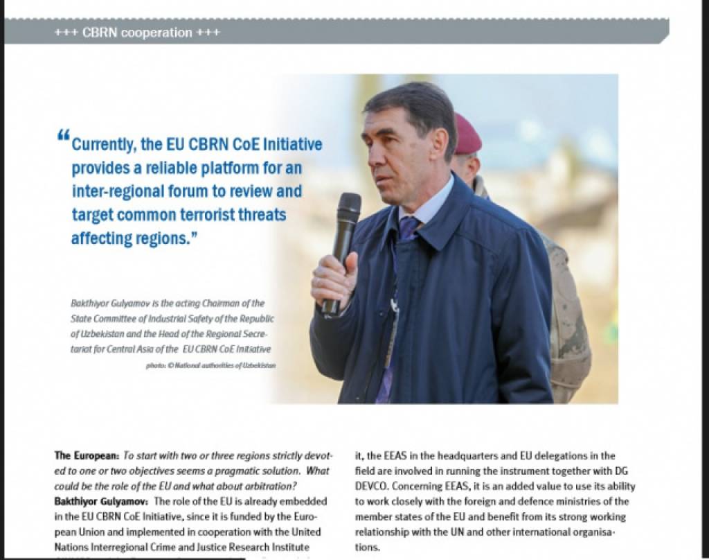 EU’s European Security and Defence Union published an interview with Bakhtiyor Gulyamov, Chairman of the State Committee of Industrial Safety of the Republic of Uzbekistan and an article by Otabek Kasimov, Head of Inspectorate on Supervision of the Implementation of the Convention on Prohibition of Chemical and Bacteriological Weapons.