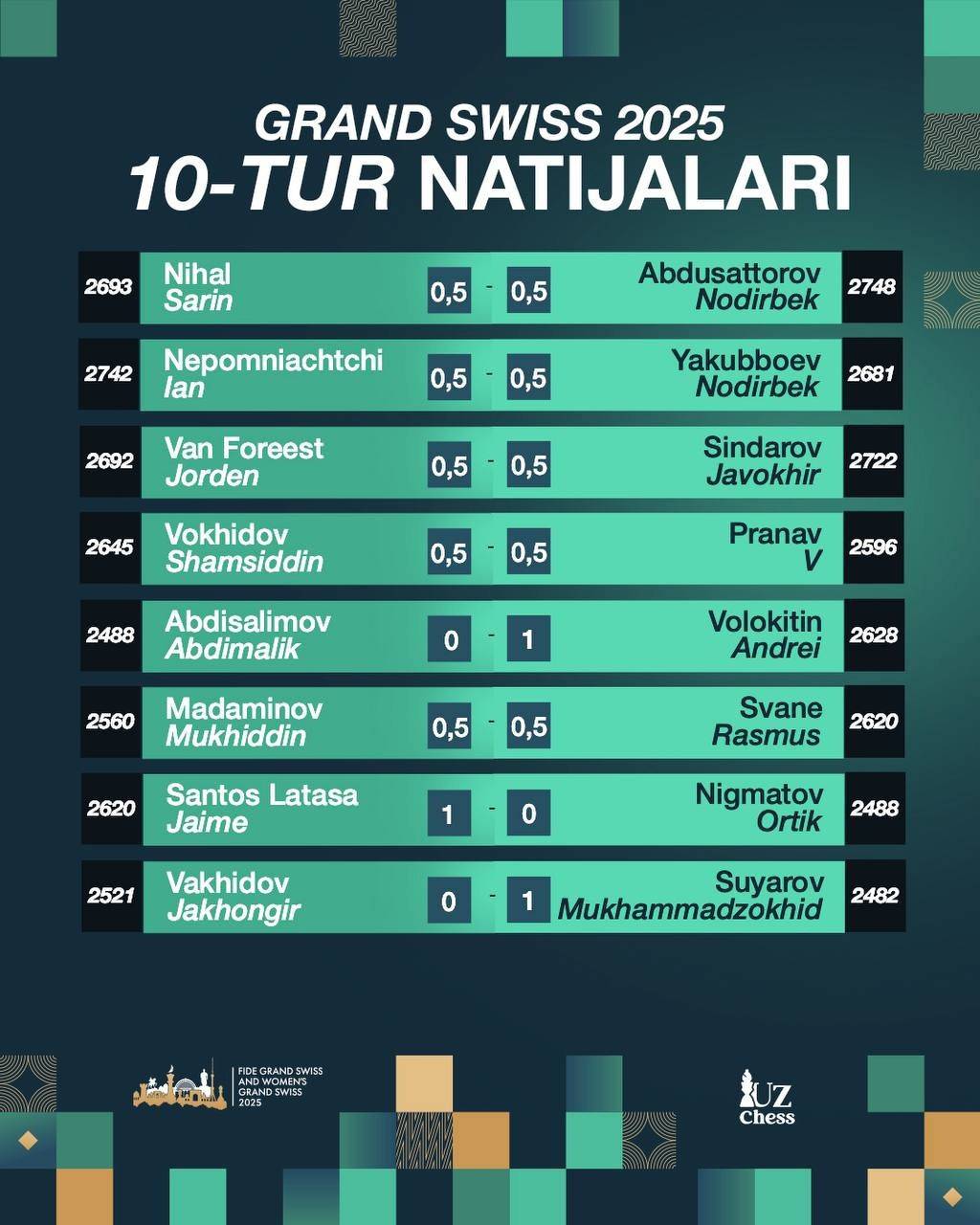 Бундай вазиятда, “Grand Swiss-2025”нинг охирги кунги қарама-қаршиликлари биз истаганимиздек интиҳо топиши мураккаб масала. Лекин шахматда ҳар иш амалга ошиши мумкинлигидан келиб чиқилса, натижалар биз кутганимиздек якунланиши ҳам эҳтимолдан йироқ эмасдек, назаримизда.