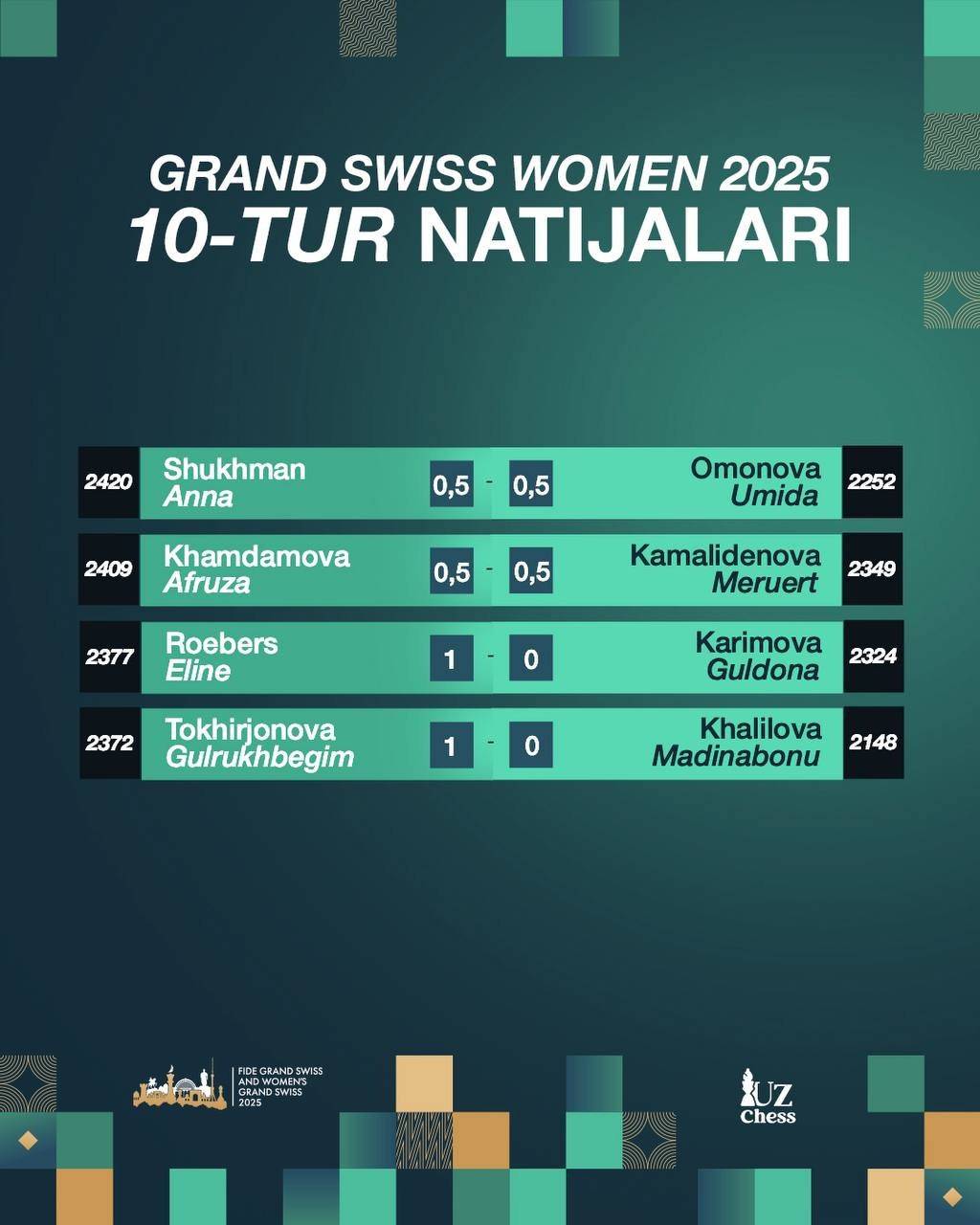 Аёллар мусобақасида маҳоратли шахматчи қизимиз Афруза Ҳамдамованинг 7 ва 9-турларда украиналик опа-сингил Анна ва Мария Музичукларга имкониятни бой бериши, 10-турда қозоғистонлик Меруерт Камалиденова билан тенг келиши уни совринли ўринларга даъвогарлар қаторидан чиқиб кетишига олиб келди.