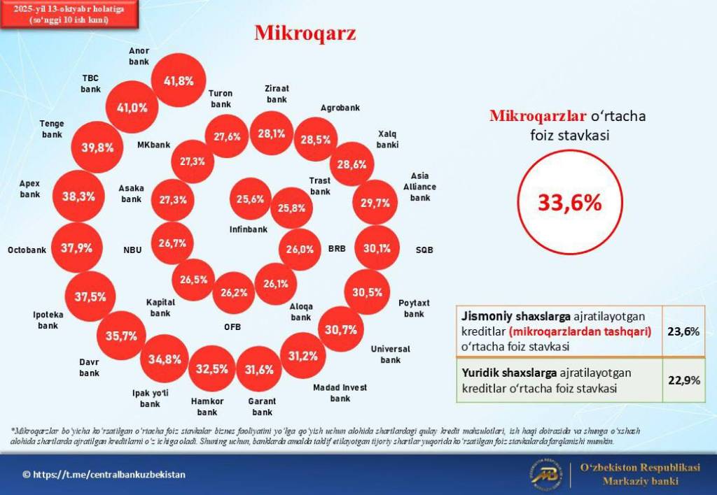 Шу билан бирга, бошқа тижорат банклари ҳам мижозларни жалб этиш мақсадида 20–30 фоиз оралиғидаги микроқарз маҳсулотларини жорий этмоқда.