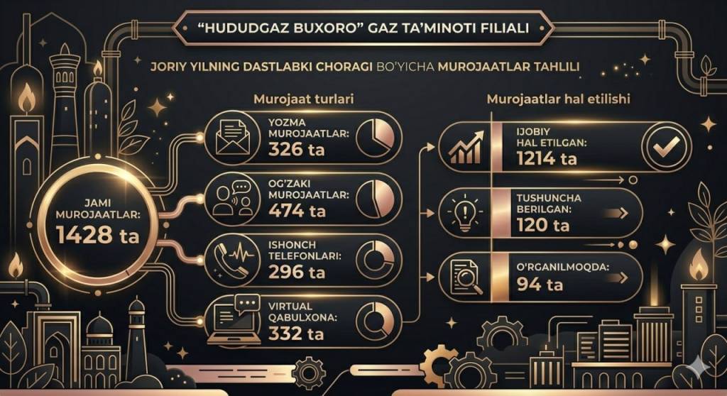 “Ҳудудгаз Бухоро” газ таъминоти филиали матбуот хизмати раҳбари Маҳигул Абдуллаеванинг маълум қилишича, жорий йилнинг биринчи чораги давомида филиалга жами 1428 та мурожаат келиб тушган. Шундан 326 таси ёзма, 474 таси оғзаки, 296 таси ишонч телефони орқали ва 332 таси виртуал қабулхона воситасида йўлланган. Ушбу мурожаатларнинг 1214 таси ижобий ҳал этилган бўлса, 120 таси бўйича тушунтиришлар берилган, 94 таси эса айни пайтда ўрганиш жараёнида.