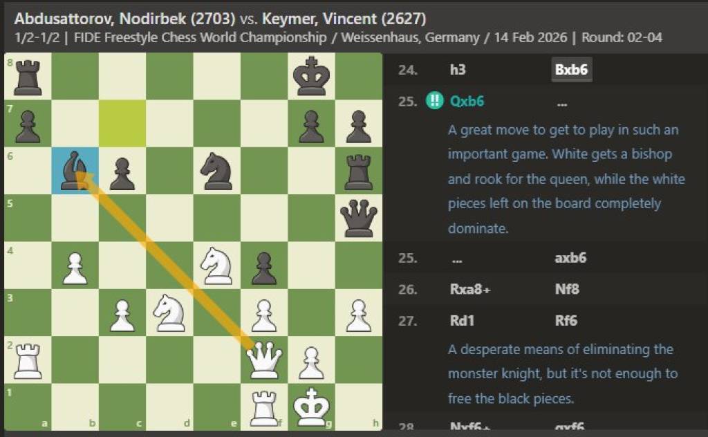 At the tournament with a $300,000 prize fund, Nodirbek beat Vincent Keymer in the third-place match, 2.5:1.5, and earned $40,000. He also qualified for the 2027 FIDE Freestyle Chess World Championship.