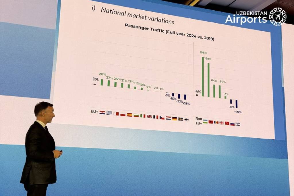 Тадбир давомида "ACI Europe" бош директори Оливе Янковец ўтган 2024 йилда ташкилотга аъзо мамлакатларда йўловчи ташишнинг пандемиядан олдинги давр - 2019 йилга нисбатан динамикаси тўғрисида тақдимот қилди.
