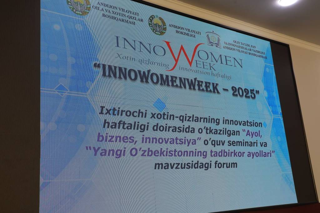 “Innowomenwek – 2025” ихтирочи хотин-қизларнинг инновацион ҳафталиги доирасида Андижон вилояти ҳокимлиги, Оила ва хотин-қизлар бошқармаси, Хотин-қизлар тадбиркорлик маркази ҳамкорлигида ташкил этилган форумда адлия, солиқ, Онлайн савдоларни ташкил этиш, Камбағалликни қисқартириш ва бандлик идоралари мутахассислари, тадбиркор ҳамда ўз бизнесини бошламоқчи бўлган хотин-қизлар иштирок этди.