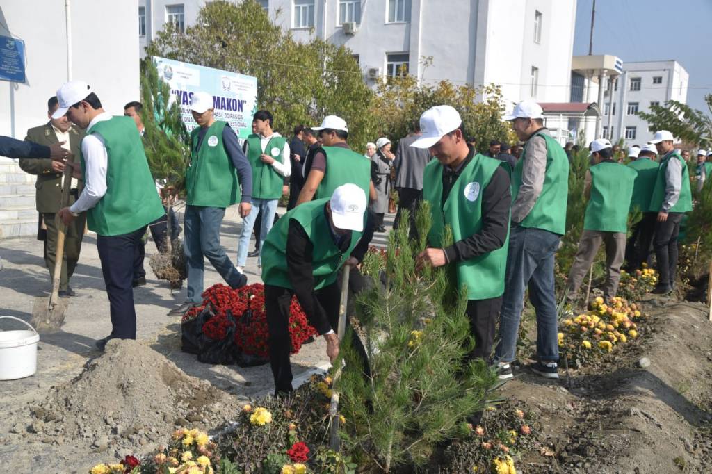 Шундан сўнг барча қатнашчилар, касб-ҳунар мактаби ўқитувчи ва ўқувчилари ажратилган майдонларга кўчатлар, гул ниҳолларини ўтқазди.