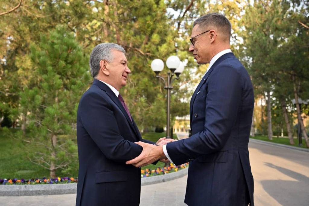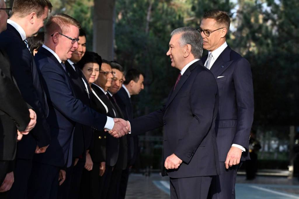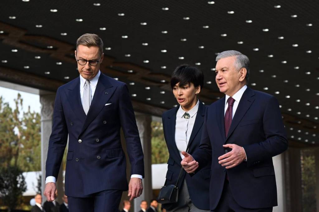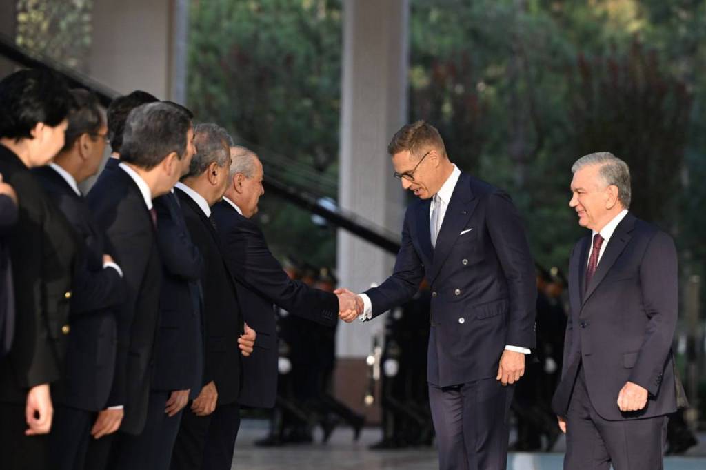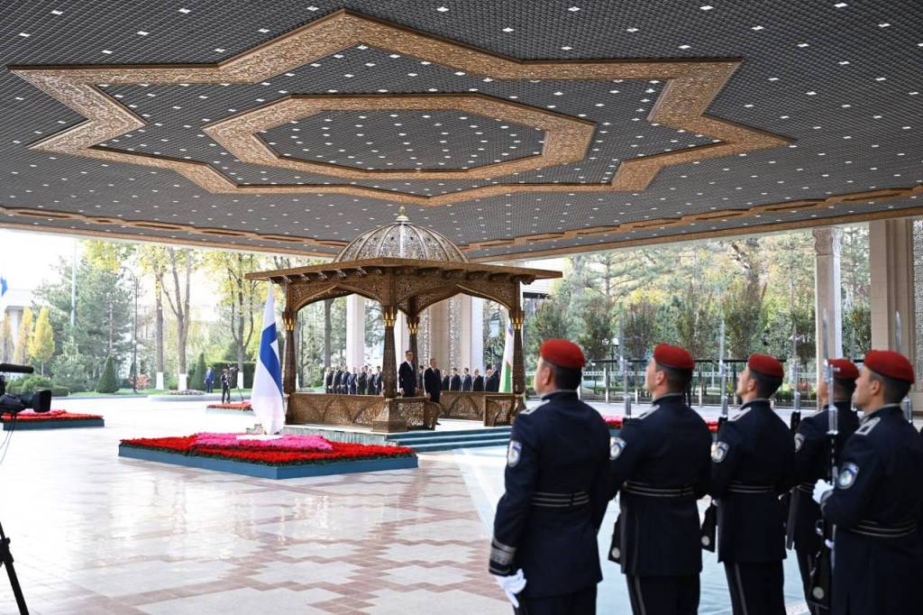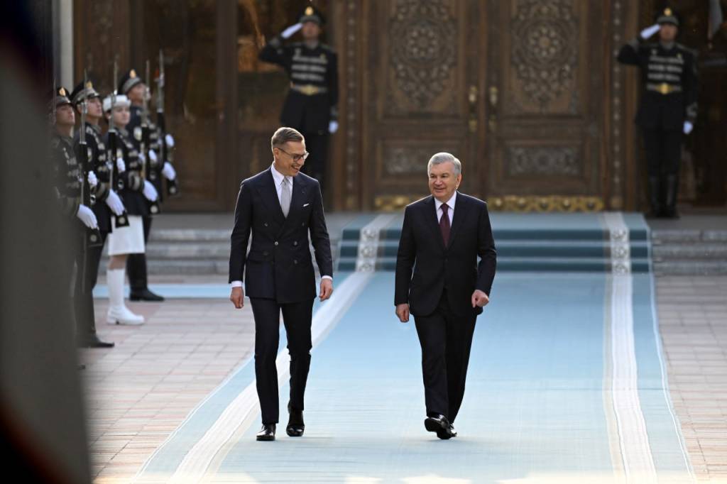 The national anthems of Uzbekistan and Finland were performed. The heads of state walked around the honor guard and introduced members of their respective official delegations.