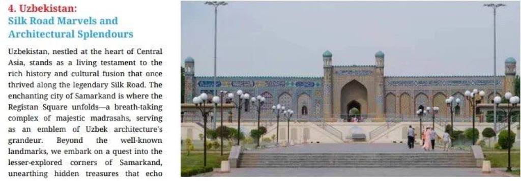 “Uzbekistan: Silk Road Marvels and Architectural Splendours” is the title of the section of the article dedicated to the tourism potential of the country. “Uzbekistan, nestled at the heart of Central Asia, stands as a living testament to the rich history and cultural fusion that once thrived along the legendary Silk Road”, Travel Links emphasizes. “The enchanting city of Samarkand is where the Registan Square unfolds a breath-taking complex of majestic madrasahs, serving as an emblem of Uzbek architecture’s grandeur”.