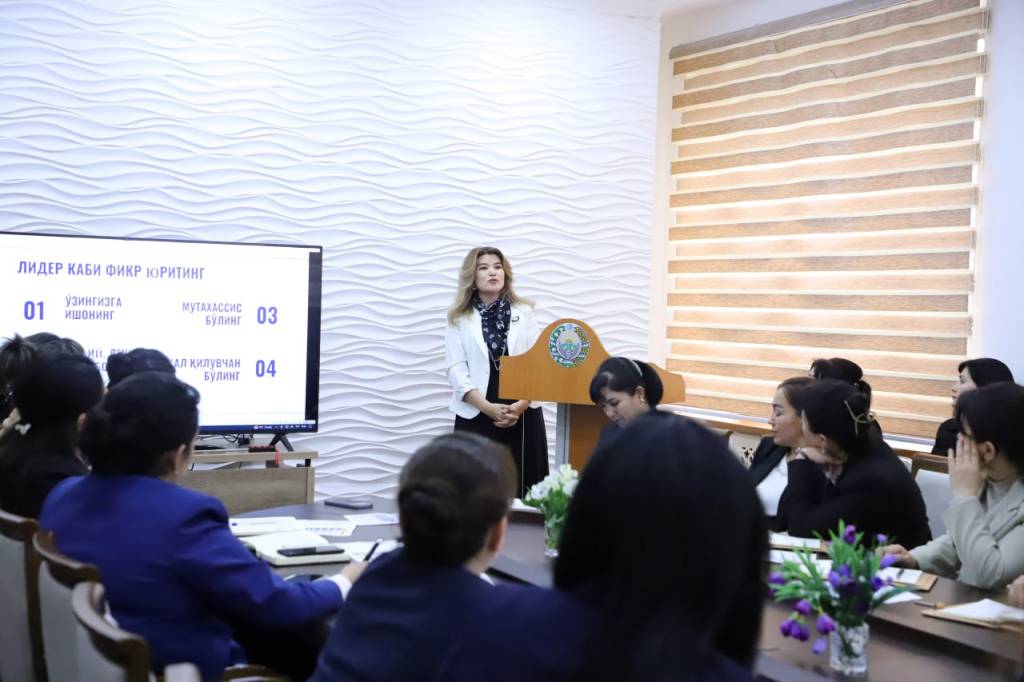 Тадбирда вилоятда раҳбар аёлларнинг салоҳиятини ошириш, уларда лидерлик қобилиятларини шакллантириш, шахсий ривожланишлари учун зарур услубий тавсиялар бериш ҳамда хотин-қизлар ўртасида давлат хизмати жозибадорлигини ошириш масалалари муҳокама этилди.