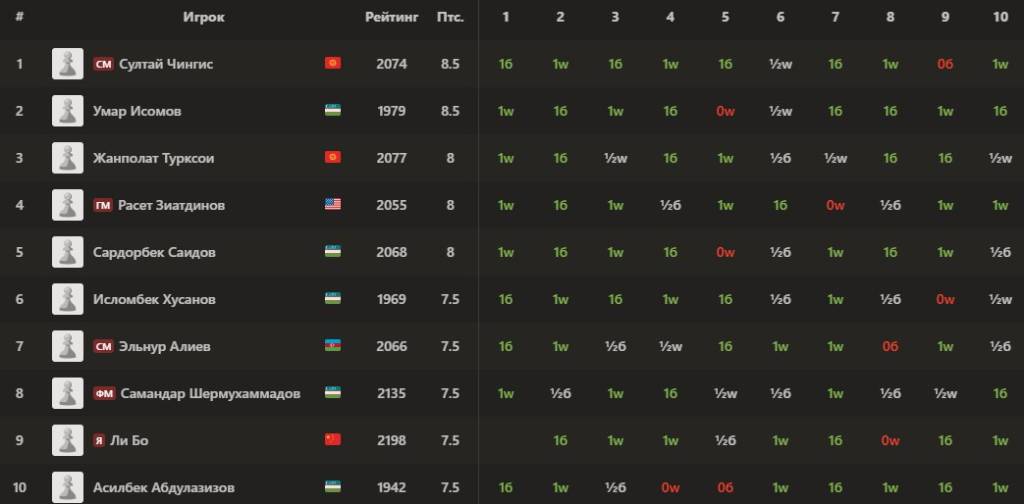 3-o‘rin Abdumalik Abdusalimovga nasib etdi. Suyarov, o‘z navbatida 7 ochko bilan qo‘shimcha ko‘rsatkichlar evaziga 6-o‘rinni band qildi.