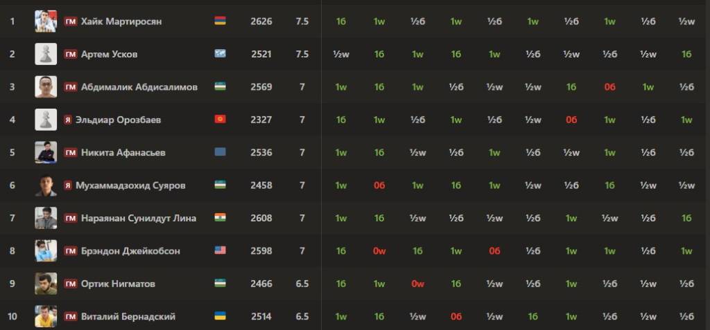 Aytish lozim, Armaniston vakili 10 ta tur davomida 5 ta g‘alaba, 5 ta durang natija qayd etdi. 2-o‘rinni band etgan FIDE bayrog‘i ostida turnirda qatnashgan Artyom Uskov oxirgi turda qora donalarda hindistonlik Abximanyu Puranikni mag‘lub etdi.