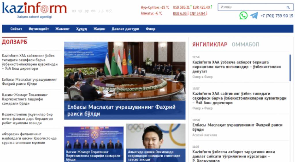 Міне бүгін Қазақстанның «Kazinform» халықаралық ақпараттық агенттігі, екі жақтық ынтымақтастықты бұқаралық ақпарат құралдары арқылы кеңінен жаңғырту мақсатында «Өзбек тілді» ақпараттық нұсқасын іске қосты.