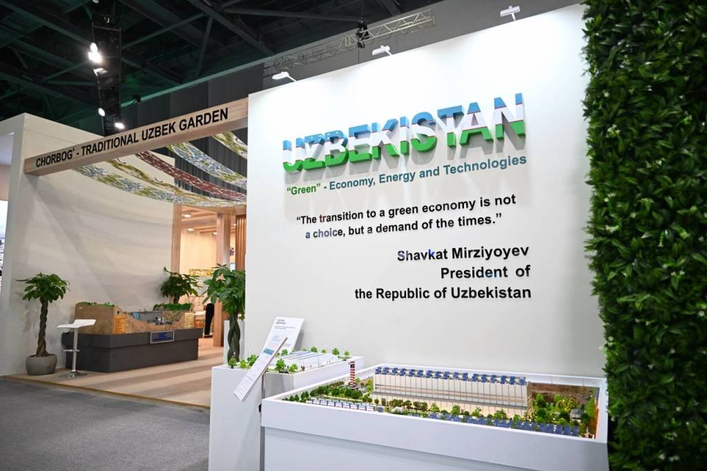 Интерфаоллик ва мультимедиа элементларига эга кўргазма-тақдимот майдони шаклида барпо этилган Ўзбекистон павильони мамлакатимизнинг экология, иқлим ўзгариши ва Марказий Осиёнинг барқарор ривожланиши соҳаларидаги давлат сиёсатининг устувор йўналишларини акс эттиради. Шунингдек, экспозиция Ўзбекистоннинг экология соҳасида минтақавий ва халқаро ҳамкорликни мустаҳкамлашга қўшаётган ҳиссасини намоён этади.