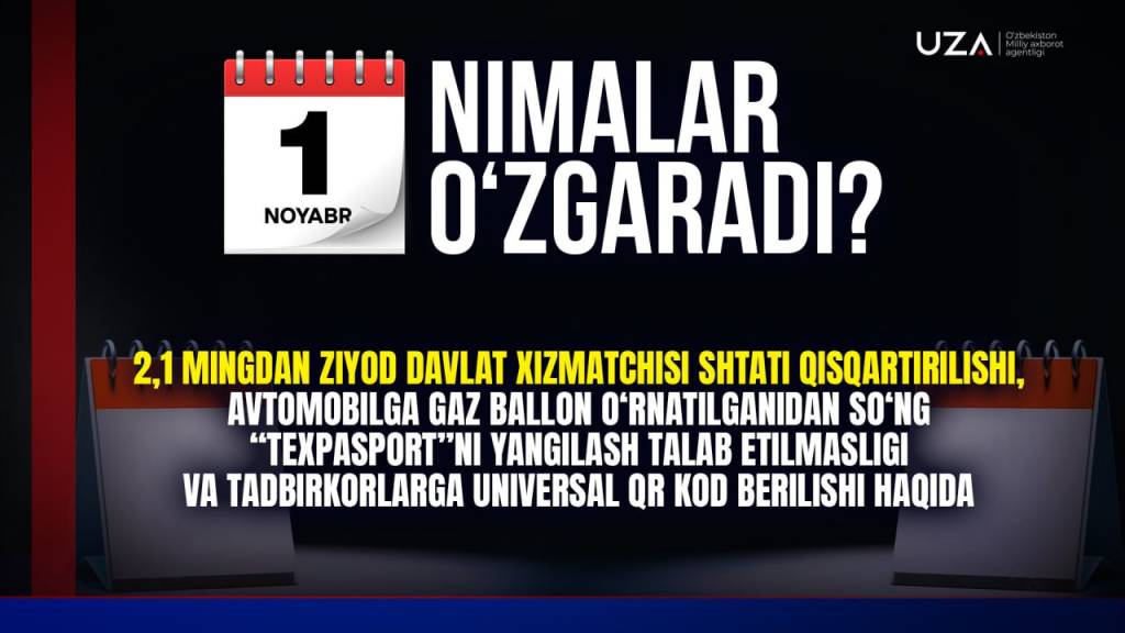 O‘zbekiston qonunchiligida 2025 yil 1 noyabrdan bir qator o‘zgarish va yangiliklar kuchga kiradi. Bugungi lavhamizda ushbu sanadan kuchga kiradigan asosiy o‘zgarishlar haqida batafsil ma’lumot beramiz.