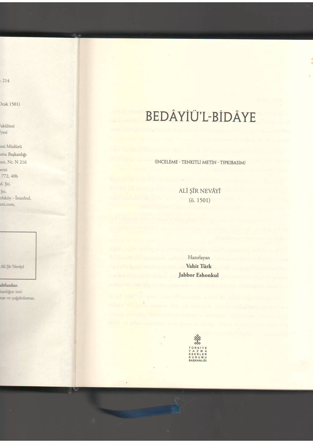 “Badoye’-ul-bidoya”ning yangi nashri turkiy dunyo adabiyotini yana birqimmatli manba bilan boyitdi. Zero, kitobning avvalida Turkiya Prezidenti Rejep Tayyip Erdog‘an ta’kidlaganidek, turli soha va fanga oid boy, noyob matnlarni asrab-avaylash, tarjima yoki faksimil nashrlarni e’lon qilish svilizatsiyaning muhim bo‘g‘inlaridan sanaladi.