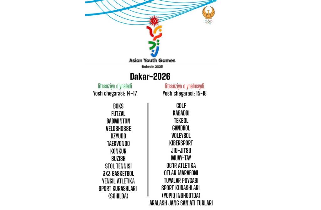 Osiyo Olimpiya kengashi ma’lumotiga ko‘ra, "Dakar-2026" yo‘llanmalari Bahrayndagi Osiyo o‘yinlaridagi yengil atletika, boks, futzal, stol tennisi, sohil kurashi, badminton, veloshosse, dzyudo, taekvondo, 3x3 basketbol, ot sportining konkur, suzish va triatlon yo‘nalishlarida o‘ynaladi. Sportchilarning yosh chegarasi 14-17 yoshni tashkil etishi nazarda tutilgan. III yoshlar Osiyo o‘yinlaridan joy olgan qolgan 13 sport turi, ya’ni tuyalarda poyga, golf, kabaddi, tekbol, og‘ir atletika, otlar marafoni, gandbol, aralash jang san’ati turlari, voleybol, kibersport, jiu-jitsu, muay-tay, sport kurashlari yo‘nalishlarida yosh chegarasi 15-18 yoshdan iborat bo‘lishi belgilangan.