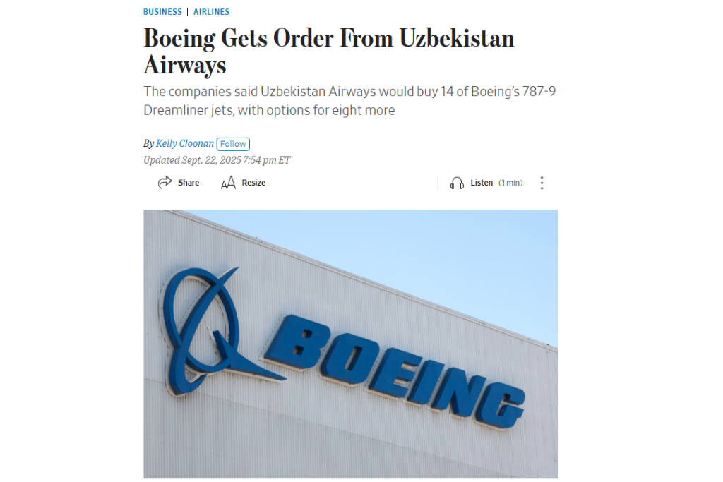 Мақолаларда “Ўзбекистон ҳаво йўллари” 8 миллиард доллардан ортиқ маблағ эвазига 22 та "Dreamliner787" самолётини харид қилишига урғу берилган. Шунингдек, АҚШ Президенти Дональд Трамп ўз ижтимоий тармоғи орқали мазкур келишувга алоҳида эътибор қаратиб, шахсан муносабат билдирган: