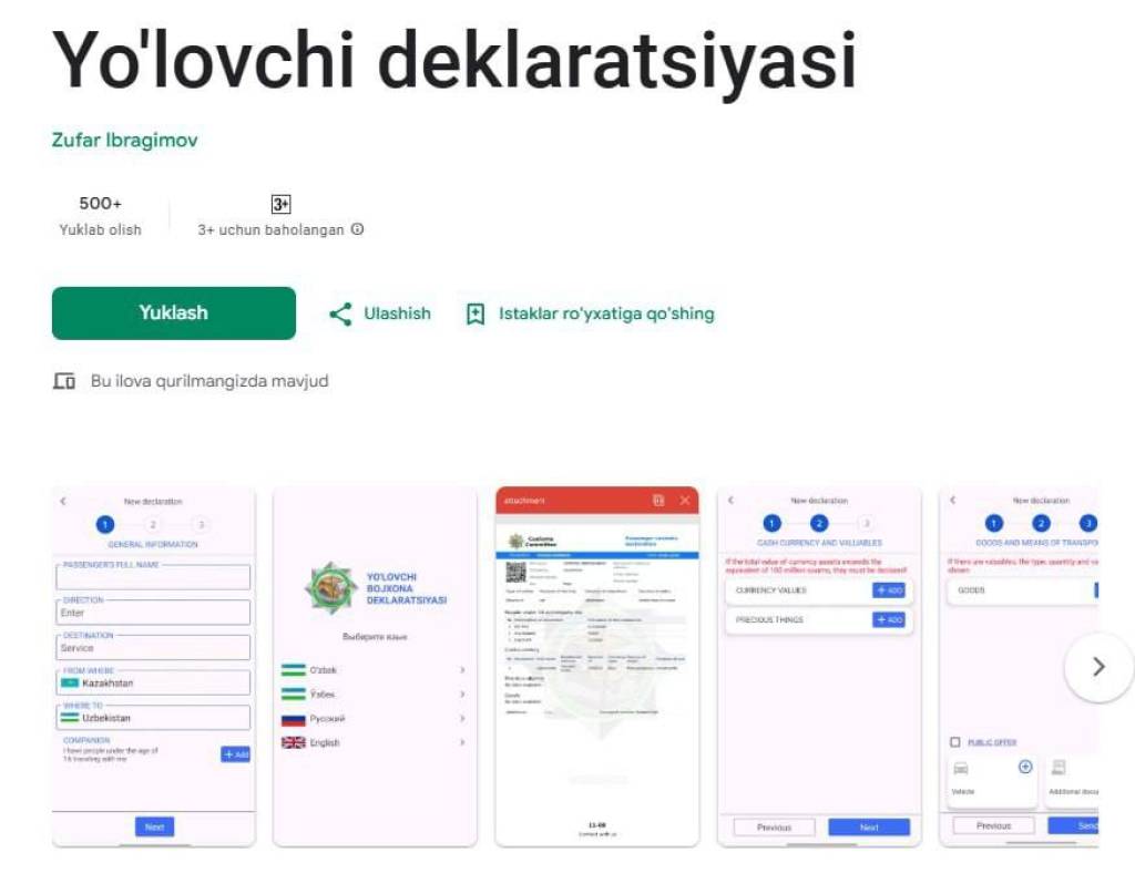 “Yo‘lovchi deklaratsiyasi” ilovasini Play Market hamda App Store orqali yuklab olish mumkin. Ilovaning imkoniyatlari fuqarolarga deklaratsiya jarayonini yanada qulay va tez bajarishga xizmat qiladi.