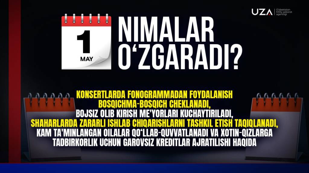O‘zbekiston qonunchiligida 2025 yil 1 maydan bir qator o‘zgarish va yangiliklar kuchga kiradi.