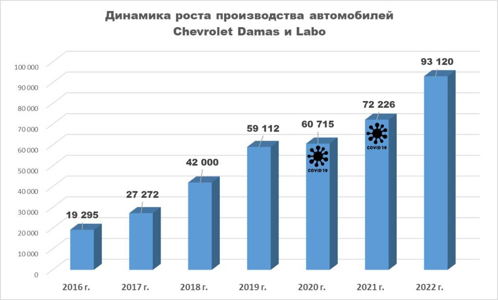 2016 yildan boshlab Xorazm viloyatidagi zavodda “Damas” va “Labo” ishlab chiqarish hajmi qariyb besh barobarga oshdi. O‘tgan yili mazkur rusumli 93 ming dona avtomobil ishlab chiqarilib, bu o‘tgan yilga nisbatan 30 foizga ko‘pdir.