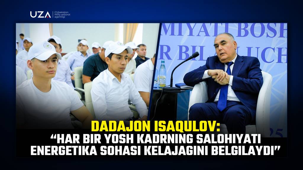 <iframe width="650" height="420" src="https://www.youtube.com/embed/6hUMtKG1LeE" title="Dadajon Isaqulov: “Har bir yosh kadrning salohiyati energetika sohasi kelajagini belgilaydi”" frameborder="0" allow="accelerometer; autoplay; clipboard-write; encrypted-media; gyroscope; picture-in-picture; web-share" referrerpolicy="strict-origin-when-cross-origin" allowfullscreen></iframe>Nasiba Ziyodullayeva, Yoqub Meliboyev, Anvarxo‘ja Ahmedov (video, montaj), O‘zA