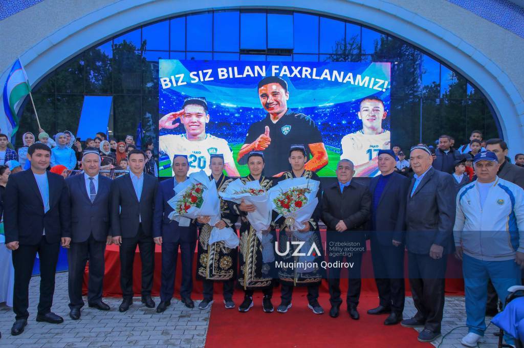 Kecha “Samo” sport majmuasida farg‘onalik chempionlarni tantanali kutib olish tadbiri bo‘lib o‘tdi. Unda so‘z olgan viloyat hokimining o‘rinbosari Sherzod Polvonov butun xalqimiz nomidan erishilgan katta yutuq bilan barcha futbol muxlislarini tabriklab, bu tarixiy g‘oliblikka munosib hissa qo‘shgan bosh murabbiy Islomjon Ismoilov Prezidentimiz Farmoniga asosan “O‘zbekistonda xizmat ko‘rsatgan sport ustozi” faxriy unvoni, futbolchilar Asilbek Aliyev va Jamshidbek Rustamovlar “Kelajak bunyodkori” medali bilan taqdirlanganini mamnuniyat bilan aytib o‘tdi. Tadbirda so‘z olganlar yosh sportchilarimizning bu tarixiy yutug‘i mamlakatimizda sportga, jumladan, millionlar o‘yini bo‘lgan futbolga katta e’tibor berilayotganining mevasi ekanligini ta’kidladilar.