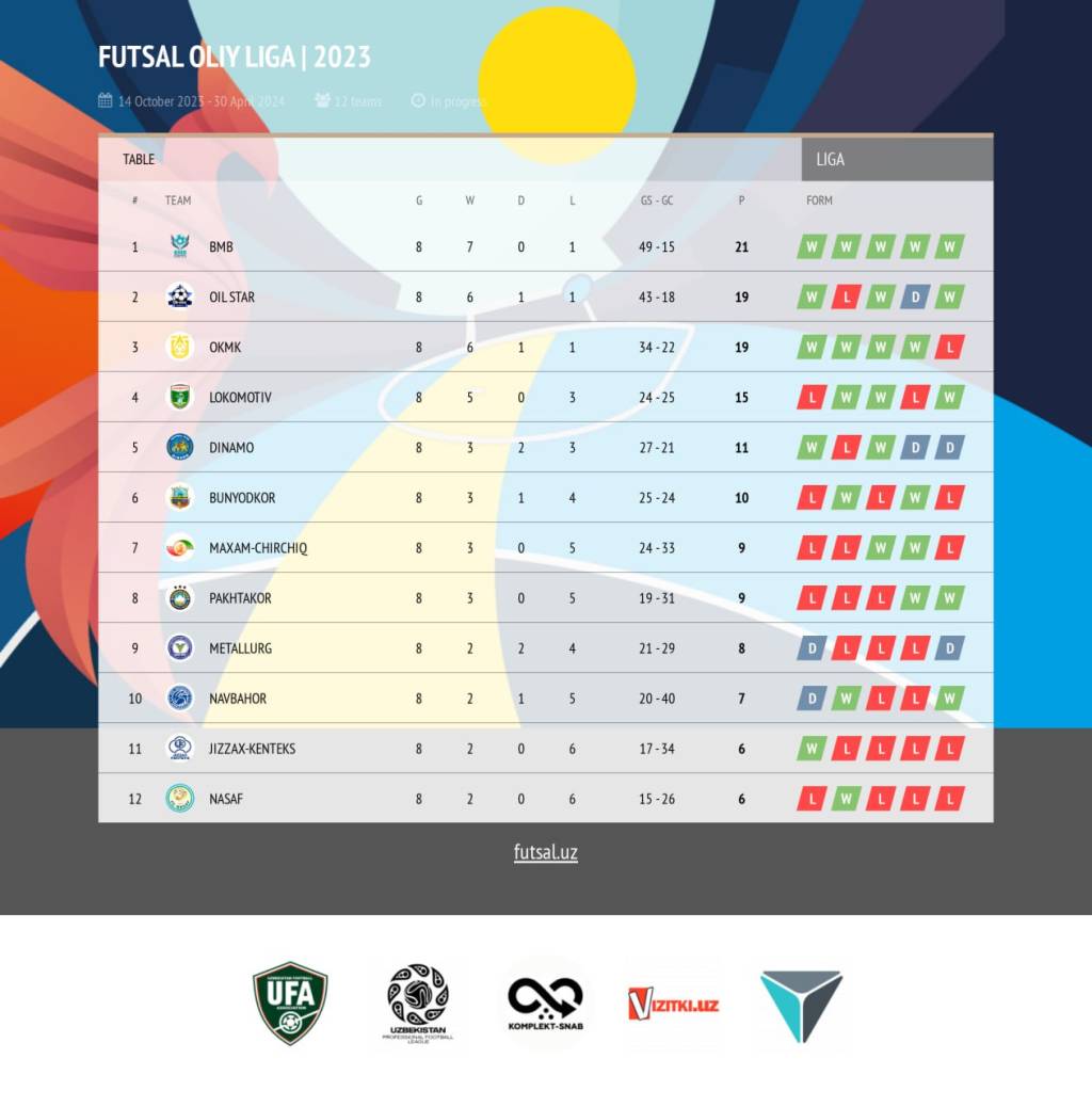 Mamlakat chempionligi uchun asosiy da’vogarlardan yana biri deb qaralayotgan, tarkibida milliy terma jamoaga 4 nafar futzalchisi chaqirilgan Olmaliqning OKMK jamoasi Qarshining “Nasaf” klubi ustidan 5:2 hisobida zafar quchgan bo‘lsa, poytaxt “derbi”si – “Bunyodkor” va “Paxtakor” o‘rtasidagi bahs 1:2 hisobida tugadi. “Jizzax Kenteks” jamoasi “Navbahor” ga kichik, 1:2 hisobida mag‘lub bo‘ldi. Yakuniy uchrashuv BMB va OKMK o‘rtasida bo‘lib o‘tdi. BMB jamoasiga – “BMB-OPERA ZAFFERANO” O‘zbekiston – Italiya qo‘shma korxonasi homiylik qilayotgan bo‘lsa, OKMK klubini Olmaliq kon-tog‘ metallurgiya korxonasi qo‘llab turibdi. Bu ikki klub o‘rtasidagi bahsda Jizzax viloyati vakillari 4:2 hisobida ustun keldi.