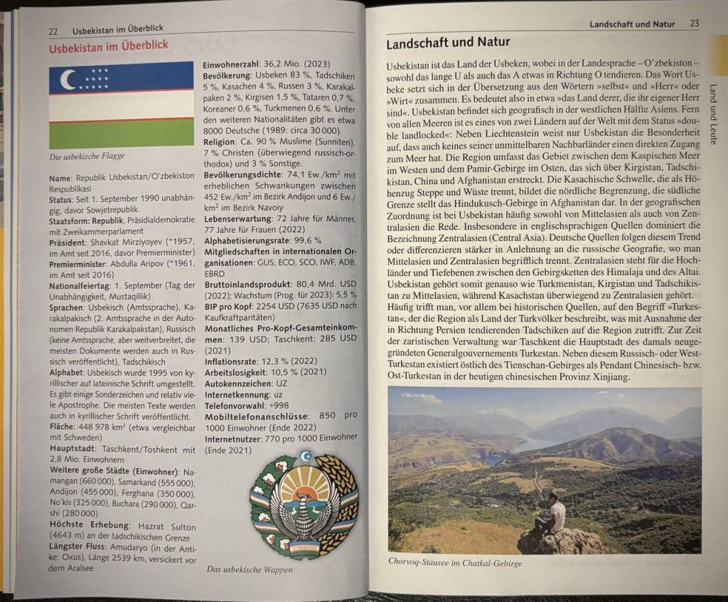 Yangi tahrirda 500 betdan ziyod hajmda rang-barang suratlar bilan chop etilgan sayyohlar kitobining yangiligi shundaki, unda mualliflar Bodo va Irina Tonslar xorijlik sayyohning muloqoti uchun zarur bo‘lgan nemis-o‘zbek-rus tillarida lug‘at taqdim etilgan. Turistlar diyorimizning tarixiy-madaniy obidalaridan zavq olishlari bilan birga o‘zbek xalqining adabiyotidan bahramand bo‘lishlari uchun nemis tiliga o‘girilgan o‘zbek adabiy asarlari ro‘yxati va ulardan parchalar keltirilgan. Masalan, ular orasida G‘afur G‘ulomning “Shum bola” asari ham bor.