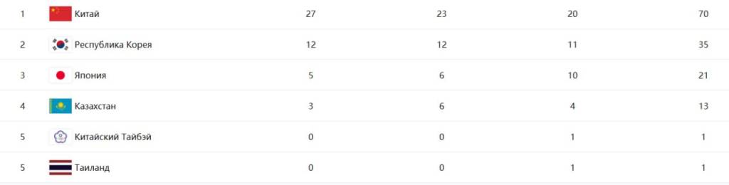 Bugungacha o‘yinlarda ishtirok etayotgan 34 ta davlatning 6 tasi sovrinli o‘rinlarni qo‘lga kiritgan. Medallar jamg‘arish borasida Xitoy sportchilari 27 ta oltin, 23 ta kumush, 20 ta bronza medali bilan 1-o‘rinda, Janubiy Koreya 12 ta oltin, 12 ta kumush, 11 ta bronza medali bilan 2-o‘rinda, Yaponiya 5 ta oltin, 6 ta kumush va 10 ta bronza medali bilan 3-o‘rinda bormoqda.