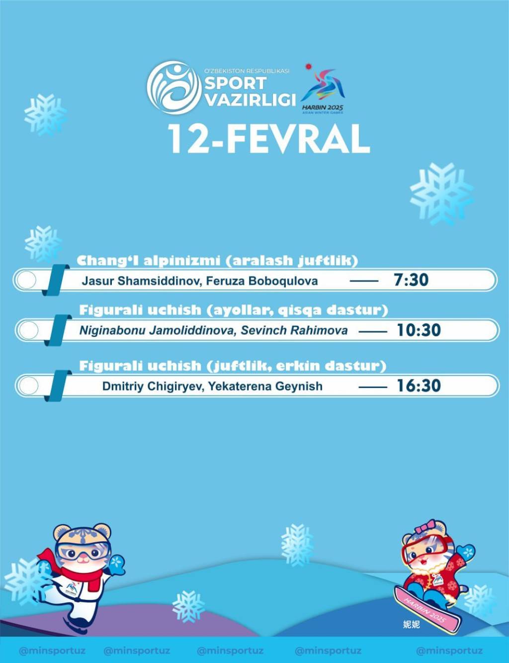 Chang‘i alpinizmining aralash juftlik bahslarida Jasur Shamsiddinov va Feruza Boboqulova vatanimiz sharafini himoya qilsa, figurali uchish sport turining turli yo‘nalishlarida Niginabonu Jamoliddinova, Sevinch Rahimova, Dmitriy Chigirev va Yekaterina Geynish o‘z omadini sinovdan o‘tkazadi.