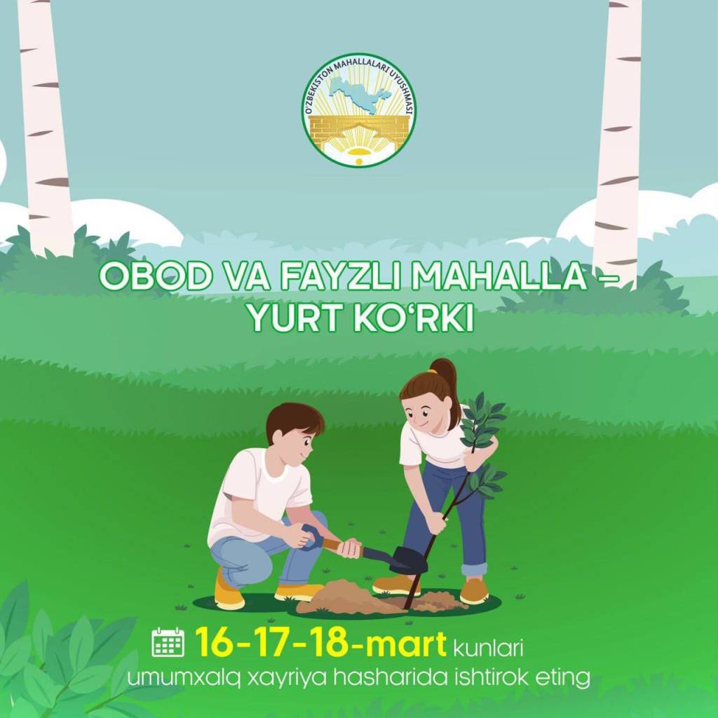 Shu maqsadida 16-18-mart kunlari “Obod va fayzli mahalla – yurt ko‘rki” shiori ostida umumxalq xayriya hashari tashkil etilmoqda. Har yili mamlakatimizda umumxalq bayramlari arafasida xayriya hashari o‘tkazish yaxshi an’anaga aylangan.