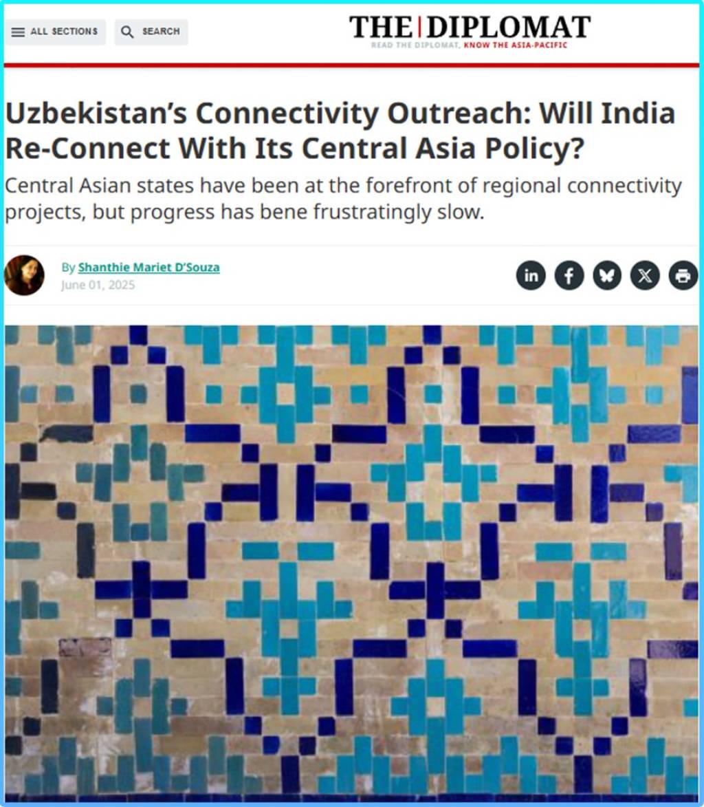 Amerikaning “The Diplomat” nashri hindistonlik professor Shanti Mariyet D'Souzaning «O‘zbekiston aloqalarining rivojlanishi: Hindiston Markaziy Osiyoga nisbatan o‘z siyosatini tiklaydimi?» nomli maqolasini chop etdi.