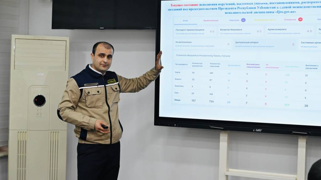 O‘quv seminarida umumiy bo‘lim boshlig‘i Lola Boboqulova, hujjatlar ijrosini nazorat qilish va muvofiqlashtirish bo‘limi boshlig‘i Turg‘un G‘aniyev, byudjetlashtirish va kontrolling boshqarmasi bosh iqtisodchisi Nurbek Farmonovlar ijro intizomi tahlili yuzasidan taqdimot qildi.