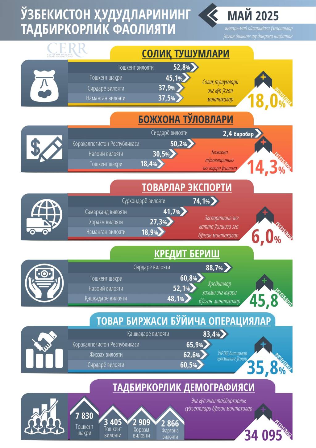 Joriy yilning may oyida iqtisodiy barqarorlik va ijobiy tendensiyalar davom etdi. Barcha asosiy ko‘rsatkichlar bo‘yicha o‘sish qayd etilgan bo‘lib, hududlardan olingan ma’lumotlar mamlakat bo‘ylab ishbilarmonlik faoliyati kengayib, ijobiy dinamika mustahkamlanib borayotganini ko‘rsatmoqda.