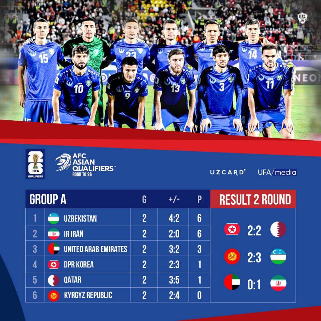 Ushbu natijalardan so‘ng O‘zbekiston va Eron 6 ochko jamg‘argan holda guruhning birinchi va ikkinchi o‘rnidan joy oldi. BAA esa 3 ochko bilan uchinchi pog‘onada qoldi. KXDR va Qatar termalari 1 ochko jamg‘arib, 4-5-o‘ringa joylashgan bo‘lsa, Qirg‘iziston terma jamoasi ikki mag‘lubiyat evaziga so‘nggi pog‘onada bormoqda.