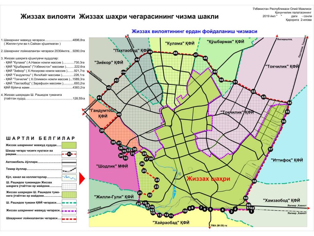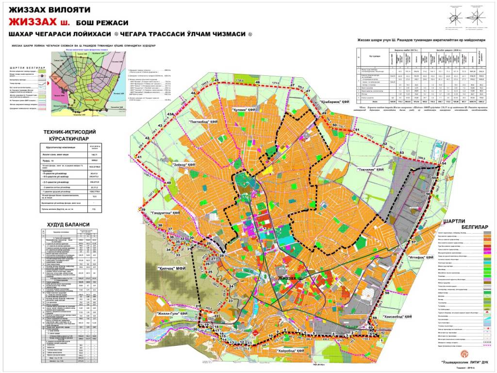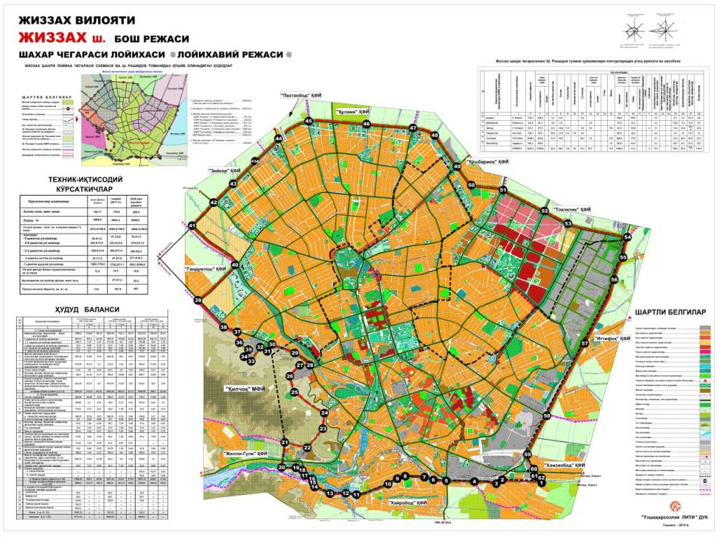 Shuningdek, Jizzax shahri bosh loyihasini ishlab chiqishda aholi punktining iqtisodiy, sanoat va hududiy salohiyati hamda aholining o‘sish sur’atlari kabi ko‘rsatkichlari ham e’tiborga olinganini ta’kidlab o‘tish lozim.