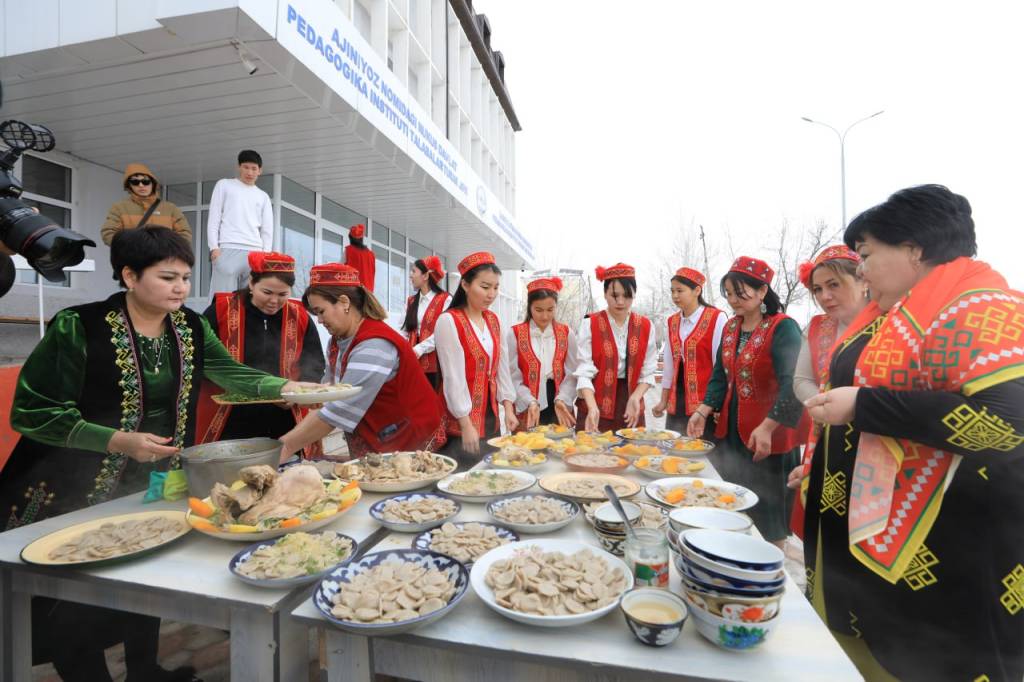 Ajiniyoz nomidagi Nukus davlat pedagogika institutida davlat-xususiy sheriklik asosida tashkil etilgan talabalar turar joyida bayram munosabati bilan “Argoniya” mas’uliyati cheklangan jamiyat hamkorligida qoraqalpoq xalqining milliy taomi – jo‘xori gurtik tayyorlandi.