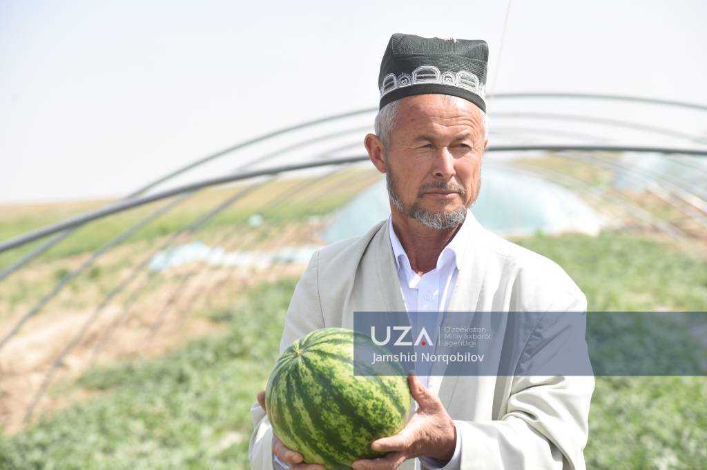 Куни кеча ижтимоий тармоқларда “Кўкдалада тарвуз пишди” сарлавҳаси остида тарқалган хабарлар ортидан, бугун фотомухбир билан Кўкдала сари йўл олдик. Туман ҳудудидан ўтар эканмиз, ўтган йили қип-қизил чўл бўлиб кўринган лалми ерларда ҳам жорий йилда гектарлаб тарвуз етиштирилаётганига гувоҳ бўлдик. Туман ҳокимининг инвестиция, савдо ва саноат бўйича ўринбосари Маъруф Пирназаров билан ҳамроҳликда эртачи тарвуз етиштирилаётган далаларга бордик. Ўша таниш тарвузчиликнинг, айтиш жоиз бўлса, “пирига” айланиб кетган Улуғбек Жуманазаровнинг даласига етиб бордик. Ҳудудда Улуғбек акадан бошқа тарвузчилар ҳам бисёр, аммо ҳар йили биринчи бўлиб Улуғбек аканинг тарвузлари пишиб, тайёр бўлади.