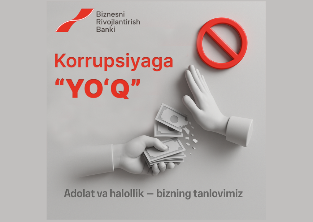 “Biznesni rivojlantirish banki” ATB veb-saytida bank Boshqaruvi raisi Saxi Annaklichevning “Korrupsiyaga murosasizlik – adolatli jamiyat poydevori” sarlavhali maqolasi e’lon qilindi. Unda jamiyat va davlat taraqqiyotiga jiddiy tahdid soluvchi korrupsiya illatining bank-moliya tizimi va tadbirkorlik rivojiga salbiy ta’siri haqida so‘z boradi.