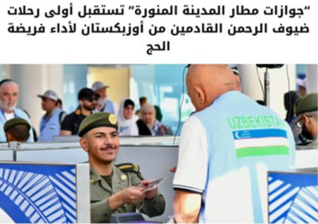 Saudiya Arabistoni Podshohligining “Al-Madina”, “Bugun”, “Al-Jazirahonline” kabi qator yetakchi nashrlari Madina shahridagi Shahzoda Muhammad bin Abdulaziz xalqaro aeroporti pasport tekshiruvi bo‘limi tomonidan Haj ziyoratini ado etish uchun borgan o‘zbekistonlik ziyoratchilarning dastlabki guruhi qabul qilinganini yoritdi.