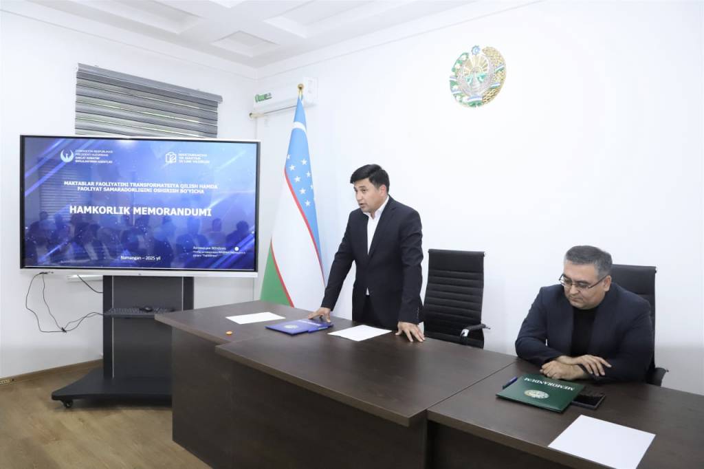 Filial rahbari Shuhrat To‘xtaboyev va boshqarma boshlig‘i A’zamjon Isoqov imzolagan memorandumda o‘qituvchilarni ochiq tanlov asosida ishga qabul qilish, ijtimoiy-psixologik tadqiqotlar orqali maktab muhitini chuqur o‘rganish, iqtidorli pedagoglarni qo‘llab-quvvatlash, zamonaviy boshqaruv usullarini joriy etish va yoshlarni davlat fuqarolik xizmatiga tayyorlash nazarda tutilgan.