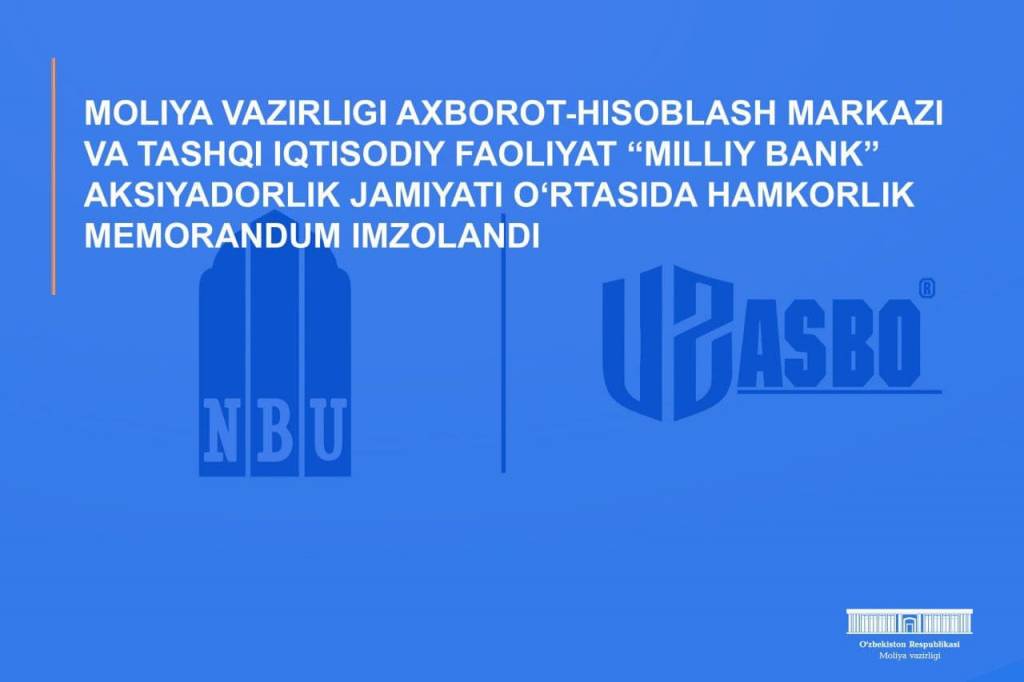 Moliya vazirligi Axborot-hisoblash markazi tomonidan «UzASBO» dasturiy majmuasini rivojlantirish va byudjet tashkilotlariga zamonaviy texnologik xizmatlarni ko‘rsatish uchun sharoitlar yaratish maqsadida, Axborot-hisoblash markazi va to‘lov xizmatlarini taqdim etuvchi Tashqi iqtisodiy faoliyat «Milliy bank» aksiyadorlik jamiyati o‘rtasida hamkorlik memorandum imzolandi.